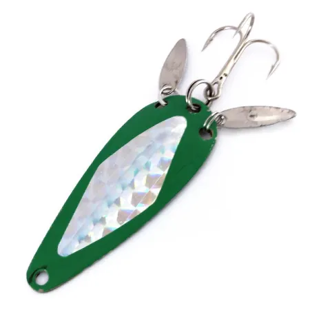 Zelený lak a holografická prizmatická nálepka s diamantovým vzorem zdobí horní stranu této vintage plandavky vyrobené ve Wisconsinu. Tato nástraha o hmotnosti 12 g (2/5 oz) a délce 6 cm (2 1/4") je vybavena inovativním prvkem v podobě dvou malých, podlouhlých akustických lamel připevněných k zadním kroužkům. Tyto stříbrné lamely vytvářejí u trojháčku dodatečné odlesky, které napodobují ocasní ploutev nástražní rybky a zároveň pomáhají maskovat háček. Na zadní straně nese leštěný niklový povrch klasickou ražbu MARATHON, značku společnosti Marathon Bait Company, která vyráběla rybářské potřeby v letech 1929 až 1979. Niklování zůstává jasné a reflexní, což dokládá kvalitu řemeslného zpracování amerických nástrah z poloviny století. Tento exemplář s kódem produktu 10006 je ve vynikajícím stavu, s hodnocením 5/5 za čistý povrch. Osazení, včetně kroužků a ostrého trojháčku, zůstává ve špičkové kondici.