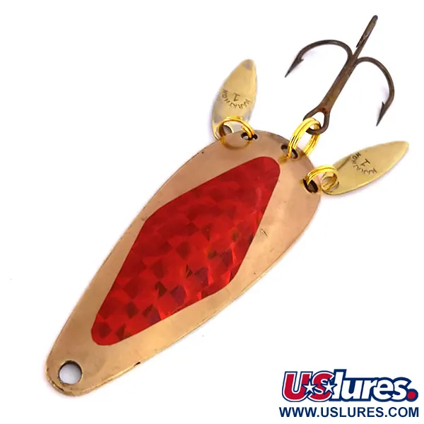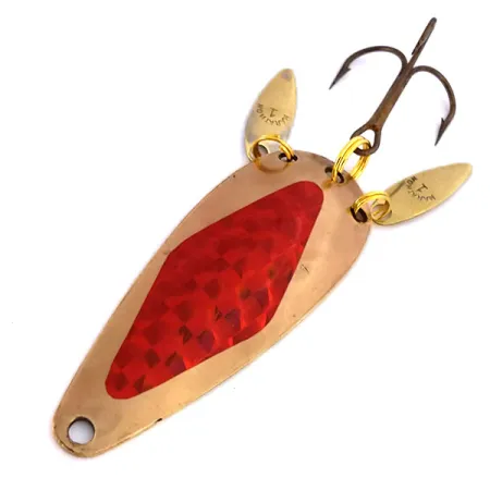 Záblesky světla odrážející se od červené prizmatické vložky okamžitě přitahují pozornost k tomuto exempláři 10275. Plandavka o hmotnosti 12g (2/5oz) se vyznačuje klasickým kapkovitým profilem s bohatou měděnou povrchovou úpravou na konvexní straně. U ocasní části jsou pomocí kroužků připevněny dva podlouhlé minilisty — často označované jako sonické plíšky — které poskytují další vrstvu vizuální přitažlivosti a zároveň pomáhají maskovat ostrý trojháček. Tyto malé zlatavé akcenty jsou opatřeny ražbou identifikátoru značky, což odpovídá čistému nápisu „MARATHON“ na leštěné konkávní straně hlavního těla o délce 6cm (2 1/4"). Tento kus pochází od společnosti Marathon Bait Company z Wisconsinu, která byla v letech 1929 až 1979 významným hráčem v americkém rybářském průmyslu, a demonstruje mechanický přístup k viditelnosti nástrahy. Barevná kombinace Měď/Červená je dobře zachovalá a veškerý hardware zůstává ve vynikajícím stavu. Tato konkrétní nástraha získává hodnocení stavu 5/5 a vypadá téměř stejně svěže jako v den, kdy opustila továrnu ve Wisconsinu.