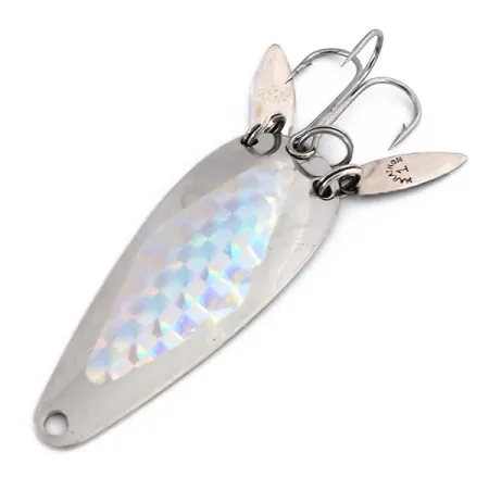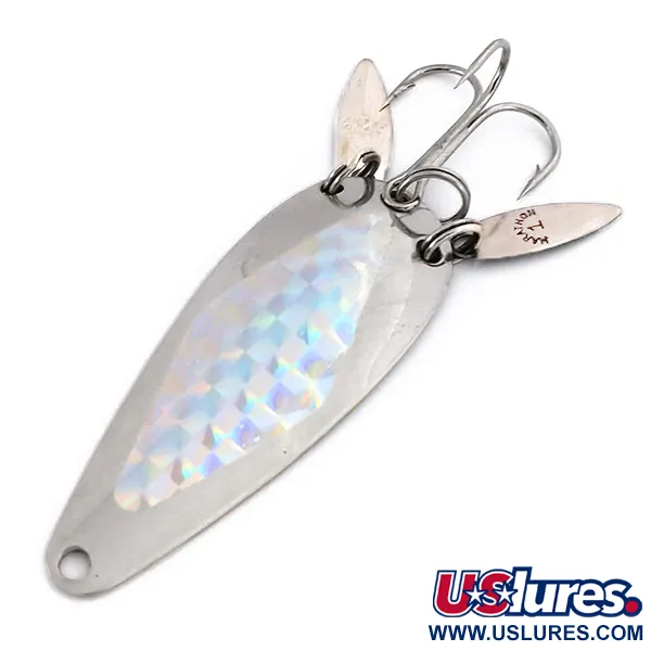 Tato 12g (2/5 oz) vážící a 6 cm (2 1/4") dlouhá poniklovaná plandavka je na své konvexní straně vybavena výraznou holografickou fólií s diamantovým vzorem. Společnost Marathon Bait Company, výrobce z Wisconsinu působící v letech 1929 až 1979, navrhla tento specifický model (kód produktu 10276) s dvojitými „sonic blades“ připevněnými k zadnímu kroužku. Tyto štíhlé mini-plíšky mají za úkol zajistit extra odlesky a jemný pohyb v blízkosti trojháčku, čímž efektivně maskují koncové osazení a zároveň přidávají sekundární vizuální prvek. Zadní strana vzorku je jasně označena raženým názvem Marathon a vykazuje vysoce reflexní povrch. Tato nástraha zůstává ve stavu 5/5, přičemž si zachovává svůj původní lesk na kovových površích i na vícehranné nálepce. Malé sekundární plíšky jsou označeny číslem 1, které udává jejich velikost v poměru k hlavnímu tělu plandavky.