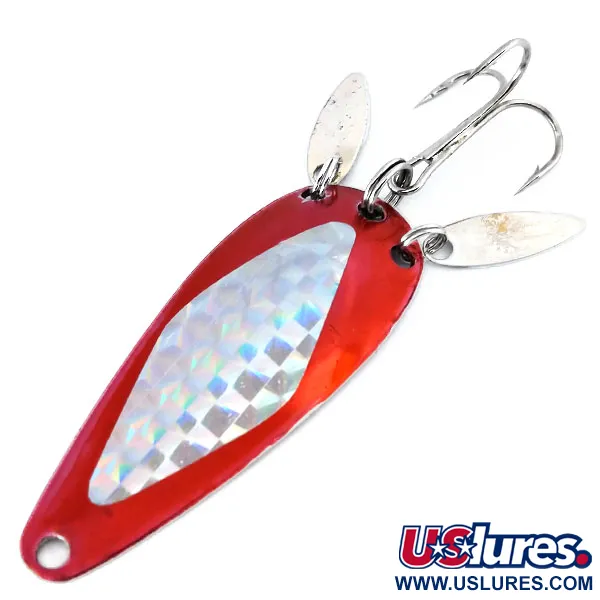 Tato plandavka Marathon se vyznačuje kapkovitým profilem doplněným zářivě červenou povrchovou úpravou a reflexní prizmatickou vložkou. Nástraha o délce 6 cm (2 1/4") a hmotnosti 12 g (2/5 oz) nese odkaz společnosti Marathon Bait Company, která působila ve Wisconsinu v letech 1929 až 1979. Na leštěné niklové zadní straně je patrná ostrá ražba „MARATHON“. Tento konkrétní model, označený kódem produktu 10363, je vybaven dvěma malými stříbrnými rotačními lístky typu „vrbový list“ upevněnými u ocasní části. Tyto pomocné lístky zajišťují při přitahování dodatečné odlesky v blízkosti trojháčku. Přední strana je opatřena holografickou páskou s diamantovým vzorem, která odráží celé spektrum světla na podkladu sytě červené barvy. Veškerý hardware, včetně kroužků a stříbrného trojháčku, je ve vynikajícím stavu (hodnocení 5/5). V hlavové části plandavky je přesně vyvrtané očko pro přímé navázání nebo použití karabinky.