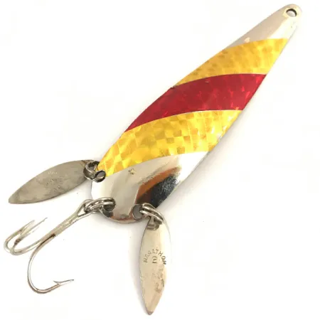 Dva malé, podlouhlé sonické plíšky jsou připevněny pomocí kroužků poblíž konce této 9,5cm (3 3/4") plandavky, což je charakteristický designový prvek společnosti Marathon Bait Company. Tento exemplář s produktovým kódem 4700 váží 17 g (3/5 oz) a na zadní straně má lesklý niklový povrch. Konvexní strana je pokryta texturovanou prizmatickou páskou se střídajícími se diagonálními pruhy zlaté a červené barvy. Nástraha pochází od výrobce z Wisconsinu, který působil v letech 1929 až 1979, a je navržena tak, aby sekundární plíšky dodávaly vizuální hloubku v blízkosti trojháčku. Tento konkrétní kus je ve velmi zachovalém stavu s hodnocením 4/5, přičemž na kovu jsou stále patrné jasné ražby. Spodní strana těla plandavky je opatřena ražbou se jménem Marathon a označením velikosti, což odpovídá značení na samotných sonických plíšcích.