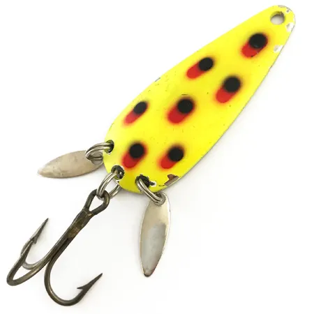 Osm výrazných černých teček na červeném podkladu zdobí zářivě žlutou přední stranu této vintage plandavky. Tento model od společnosti Marathon Bait Company o délce 2 1/4" (6 cm) a hmotnosti 2/5 oz (12 g) se vyznačuje unikátním uspořádáním dvou stříbrných akustických lamel upevněných u konce nástrahy. Tyto malé, podlouhlé lamely jsou navrženy tak, aby odrážely světlo přímo v místech, kde se nachází ostrý trojháček. Zadní strana nástrahy je klasicky poniklovaná a opatřená hluboce raženým nápisem „MARATHON“ do oblouku, což je charakteristický znak výrobce z Wisconsinu působícího v letech 1929 až 1979. Plandavka s kódem 5410 vykazuje lehké známky používání s drobnými povrchovými oděrkami u očka a konce, což odpovídá hodnocení stavu 4/5. Osazení, včetně kroužků a trojháčku v tmavé povrchové úpravě, zůstává robustní a nepoškozené.