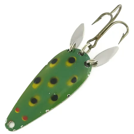 Výrazný vzor „Frog“, tvořený černými a žlutými skvrnami na zeleném podkladu, zdobí přední stranu této 12g plandavky. Tento exemplář s produktovým kódem 7175 je vybaven dvěma malými stříbrnými „akustickými plíšky“ připevněnými pomocí kroužků u trojháčku. Tyto speciální kapkovité plíšky jsou navrženy tak, aby vytvářely vizuální odlesky a vibrace a zároveň částečně maskovaly háček. Nástraha měří 6 cm (2 1/4") a na zadní straně má povrchovou úpravu z leštěného niklu, do které je vyražena značka Marathon. Vyrobena společností Marathon Bait Company, wisconsinským gigantem v letech 1929 až 1979, zůstává tato nástraha ve stavu 4/5 se zachovalým lakem a čistým kovem. Očko na užším konci slouží k připevnění pro přívlač nebo trolling, zatímco široká zaoblená zadní část drží kroužek s trojháčkem.