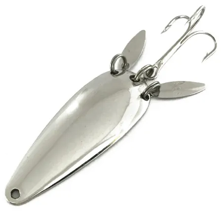 Leštěné niklování pokrývá celé 6 cm (2 1/4") tělo této vintažní plandavky, která je dokladem řemeslné zručnosti společnosti Marathon Bait Company během její padesátileté historie ve Wisconsinu. Nástraha o hmotnosti 12 g (2/5 oz) se vyznačuje unikátní konfigurací, kdy jsou pomocí kroužků v blízkosti háčku připevněny dva malé sonické plíšky ve tvaru kapky. Tyto pomocné plíšky slouží dvojímu účelu: dodávají profilu nástrahy extra odlesky a částečně maskují velký trojháček, čímž lépe napodobují vzhled prchající nástražní rybky. Tento konkrétní model s produktovým kódem 7269 představuje chytré inženýrství, díky němuž se Marathon stal dominantním americkým výrobcem v letech 1929 až 1979. Stav je vynikající 5/5, kovové povrchy zůstávají jasné a ražené detaily jsou ostré. Čistě vyvrtané očko na užším konci doplňuje kapkovitý design určený pro přívlač nebo trolling v různých sladkovodních podmínkách.