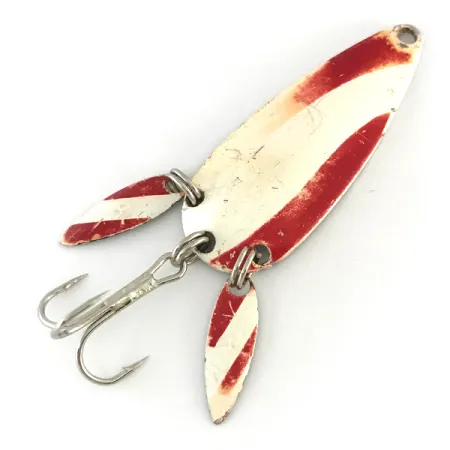 Diagonální červené a bílé pruhy tvoří vysoce viditelný vzor na přední straně této 4,5 cm (1 3/4") plandavky. Na poniklované spodní straně je vyražen název značky Marathon, což je značka společnosti z Wisconsinu, která působila v letech 1929 až 1979. Tento konkrétní kus nese kód 8200 a vyznačuje se dvojicí sonických plíšků na konci. Tyto dva malé, protáhlé kovové plíšky kmitají v blízkosti trojháčku, čímž vytvářejí dodatečné odlesky a maskují siluetu háčku. S hmotností 8g (1/4oz) je nástraha vyvážena pro všestranné nahazování. Stav je hodnocen 4/5, přičemž barva vykazuje mírné známky stáří, zatímco podkladový niklový povrch zůstává jasný. Pevně připevněné komponenty drží plíšky i trojháček na místě, čímž zachovávají původní konfiguraci tohoto v USA vyrobeného náčiní.