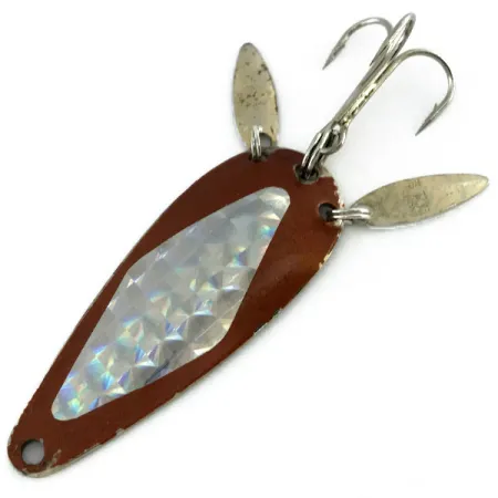 Hnědý smalt pokrývá přední stranu této 6 cm (2 1/4") plandavky, kterou zvýrazňuje centrální fasetovaná reflexní samolepka s diamantovým vzorem, jež zachycuje světlo z mnoha úhlů. Tento exemplář odráží řemeslnou zručnost poloviny století společnosti Marathon Bait Company, tradičního výrobce z Wisconsinu, který působil v letech 1929 až 1979. Nástraha váží 12 g (2/5 oz) a vyznačuje se specifickým designem „sonic blade“, kdy jsou dva malé oválné kovové lístky připevněny k pojistným kroužkům přímo nad trojháčkem pro zajištění dodatečných odlesků. Na zadní straně je čistý niklový povrch jasně ražen názvem „MARATHON“, což potvrzuje jeho původ pod produktovým kódem 9478. Nástraha s hodnocením 5/5 vykazuje jen minimální známky stáří, hnědý lak zůstává sytý a kovové součásti jasné. Výbava zahrnuje robustní trojháček a předvrtané očko na zúžené špičce, což je typické pro univerzální nástrahy vyráběné v USA během padesátileté historie značky Marathon.