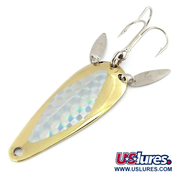 Tato plandavka klasického kapkovitého tvaru má tělo se zlatou povrchovou úpravou, které je na konvexní straně zvýrazněno zářivým prizmatickým vzorem šupin. Na konkávní zadní straně je jasně vyraženo jméno „MARATHON“, značka společnosti Marathon Bait Company, která vyráběla nástrahy ve Wisconsinu v letech 1929 až 1979. Tento konkrétní kus, kód produktu 9680, měří 6 cm (2 1/4") a váží 12 g (2/5 oz). Dva malé, niklované sonické plíšky jsou připevněny těsně nad trojháčkem, aby vytvářely další světelné odlesky a vizuálně maskovaly kovové prvky nástrahy. Tato nástraha je ve stavu 5/5, s čistou povrchovou úpravou na pokoveném těle i přídavných plíšcích.
