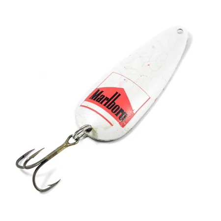 Klasický 7cm profil definuje tuto raženou kovovou plandavku, která slouží jako unikátní rybářský suvenýr spojený s tabákovou značkou. Tento předmět s produktovým kódem 1964, původně vyrobený v USA, vykazuje bílou perleťovou povrchovou úpravu na konvexní straně, které dominuje ikonické červené logo Marlboro. Na druhé straně se nachází kontrastní poniklování, které poskytuje nezbytný záblesk očekávaný od tradičního designu plandavek. Při hmotnosti 16 g je dostatečně solidní pro různé techniky nahazování nebo trollingu. Součástí výbavy je trojháček ve vintage stylu připevněný robustním kroužkem na ocase. Nástraha je ve stavu 3/5, vykazuje autentické opotřebení laku a kovu, které podtrhuje její historii u vody. Jedno očko na hlavě umožňuje snadné navázání na vlasec nebo návazec.