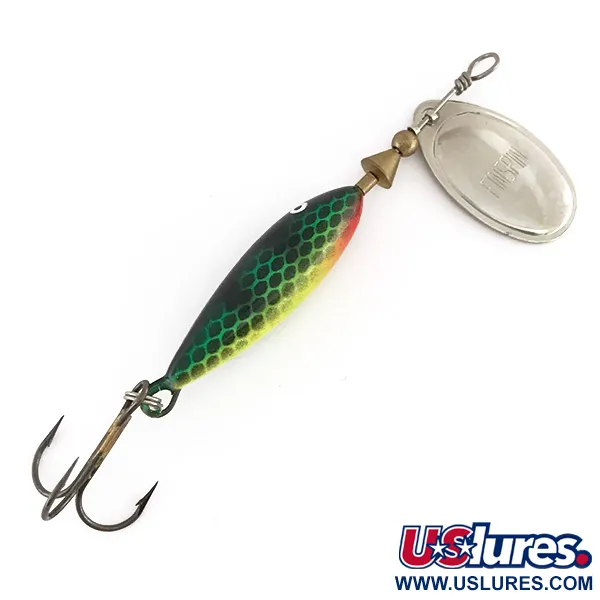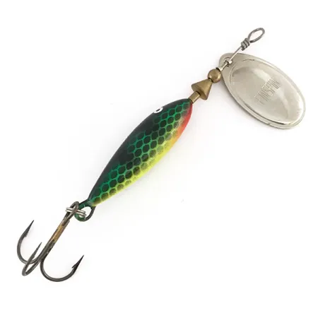 Výrazný zelený vzor šupin v podobě včelí plástve s přechody do žlutých a černých tónů charakterizuje zátěžové tělo této rotační třpytky Matzuo FinSpin s produktovým kódem 7894. Při délce 8,25 cm (3 1/4") konstrukce zahrnuje leštěný stříbřitý list ve tvaru vrbového listu s vyraženým názvem modelu, upevněný na třmínku pro hladkou rotaci. Třpytka o hmotnosti 7g (1/4oz) je postavena na robustním drátěném středu s mosaznými distančními podložkami a horním očkem pro uchycení. Lakovaný povrch je precizní s jasnými detaily očí, což odpovídá hodnocení stavu 5/5. Zaměření značky Matzuo na realistické textury je patrné v hloubce mřížky šupin, která doplňuje reflexní kovové prvky a jeden ostrý trojháček připevněný pomocí kroužku.