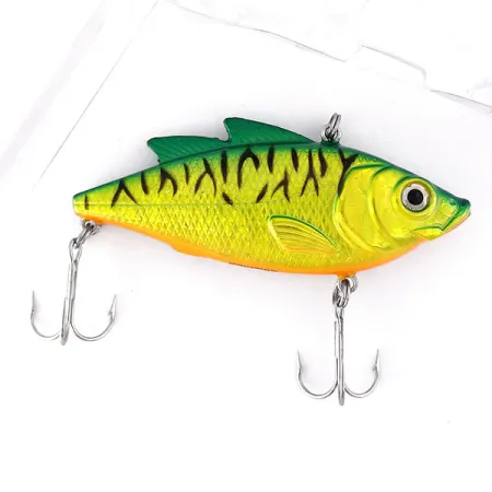Zlatavé boky přecházející do zářivě zeleného hřbetu definují estetiku Fire Tiger tohoto vibračního wobleru Matzuo Lipless UV. Tento model o délce 7,5 cm (3") nese produktový kód 10502 a je vybaven speciální UV reaktivní povrchovou úpravou pro zvýšení viditelnosti při slabém osvětlení nebo v kalné vodě. Nástraha je konstruována jako potápivá, což umožňuje variabilní hloubku ponoru v závislosti na rychlosti navíjení a síle vlasce. Její hmotnost 14 g (1/2 oz) poskytuje potřebnou zátěž pro daleké hody v hluboké vodě nebo trolling na dravce, jako jsou štiky, candáti a okouni. Dva trojháčky jsou k břichu a ocasu připevněny pomocí pevných kroužků, což odpovídá odolné konstrukci očekávané pro lov lososů nebo pstruhů. Tato konkrétní nástraha je v nepoužitém stavu, se zachovalou tovární úpravou texturovaných šupin a jasně oranžového břicha. Vnitřní chrastící systém tohoto bezlopatkového wobleru zajišťuje akustickou stopu, zatímco velké realistické oko slouží jako výrazný bod pro útok dravce.