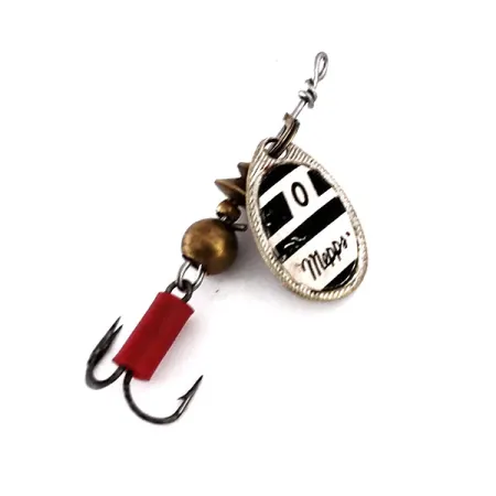 S hmotností 2,5 g (3/32 oz) má tento kompaktní spinner na zadní straně stříbrného listu vyraženo ikonické „MADE IN FRANCE“. List s bílou lícní stranou zdobí vysoce kontrastní černé pruhy a nápis „0 Mepps“, což jej označuje za precizní nástroj pro jemný rybolov. Tělo z masivní mosazi se skládá z kuličky a kuželového závaží, vyváženého pro rotaci kolem osy. Na konci je ostrý trojháček osazen jasně červenou bužírkou, která slouží jako bod útoku. Sestaveno v USA z francouzských komponentů, celková délka činí 4,5 cm (1 3/4"). Stav je 5/5, s čistou povrchovou úpravou a jasným značením. Konstrukce využívá systém rotace listu na kuželu, který zajišťuje okamžitý chod při zahájení navíjení. Tento exemplář s kódem 10196 představuje klasickou konfiguraci Aglia, která je stálicí od svého vynálezu v roce 1938.