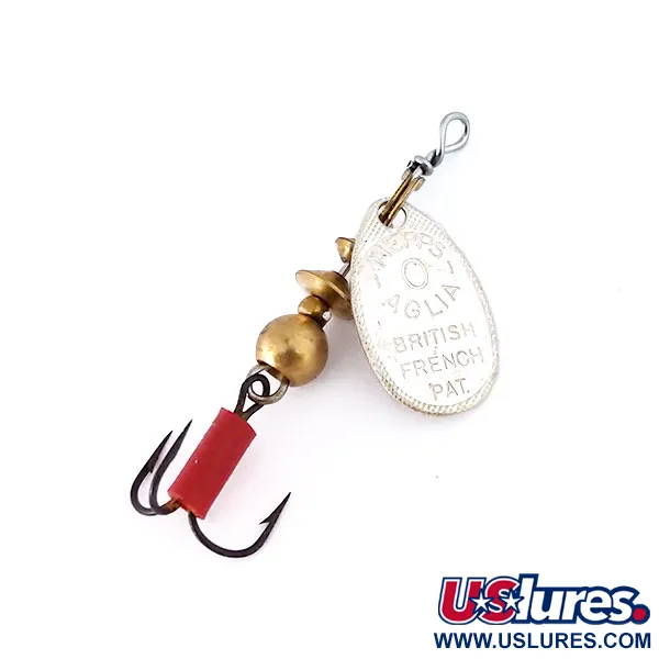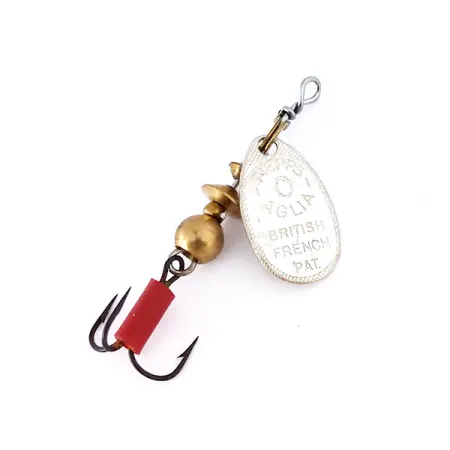 Ražba na stříbrném listu s originálními nápisy „British French Pat.“ a „Aglia“ přímo odkazuje na vynález Andreho Meulnarta z roku 1938. Tento exemplář velikosti 0 váží 2,5 g (3/32 oz) a měří 4,5 cm (1 3/4"), což z něj činí ideální volbu pro ultra-light přívlač. Na zadní straně listu je jasné označení „Made in France“, zatímco samotná nástraha byla sestavena v USA. Středové tělo tvoří mosazné korálky a zatížená základna, která zajišťuje stabilitu rotačního systému s třmínkem. Výrazným detailem je trojháček opatřený červenou plastovou bužírkou, která slouží jako zrakový bod pro pstruhy nebo okouny. Ve stavu 5/5 je stříbrný povrch mimořádně jasný a mosazné komponenty čisté, což svědčí o pečlivém uchování. Drátěná osa je pevně stočena u očka, což potvrzuje odolné provedení očekávané u kódu 10339. Široký profil listu je navržen tak, aby se okamžitě po začátku navíjení roztočil a vytvořil mechanický odpor potřebný pro chod třpytky v různých hloubkách.