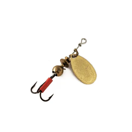 Tato klasická rotační třpytka, měřící přesně 4 cm od očka po oblouček háčku, vykazuje preciznost svých francouzských komponentů. Nadšenci značky Mepps ocení jasně zlatou povrchovou úpravu rotačního listu u tohoto modelu velikosti 0. Jde o volbu barvy pocházející z původního návrhu Andreho Meulnarta z roku 1938, určenou pro výrazné odlesky. Tělo se skládá ze stupňovitých mosazných korálků a centrálního sférického závaží, které přechází v ostrý trojháček doplněný signifikantní červenou bužírkou. S hodnocením stavu 5/5 vypadá nástraha výjimečně zachovale a veškeré kovové prvky jsou pevně na svém místě. Tento konkrétní kus, identifikovaný pod kódem produktu 11120, váží 2,5 g a byl sestaven v USA s použitím originálních dílů z Francie. Drátěná osa je rovná a nese kuželovitý třmínek, který umožňuje listu volnou rotaci kolem středové osy.