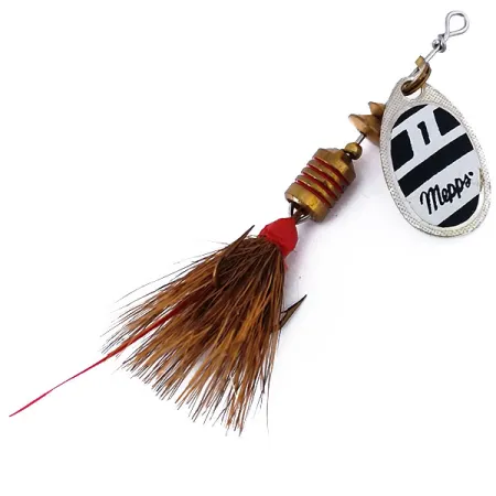 Černobíle pruhovaný vzor na listu velikosti 1 poskytuje vysoce kontrastní vizuální profil, který rybáři často vyhledávají pro lov za špatných světelných podmínek. Tato třpytka Mepps Aglia 1 Dressed o hmotnosti 1/8 oz (3,5 g), označená kódem 10433, má celkovou délku 5 cm (2") a vykazuje pečlivou montáž typickou pro přechodné období značky Mepps, kdy byly komponenty vyrobené ve Francii kompletovány v USA. Zadní strana listu je jasně ražena nápisem „MADE IN FRANCE“, což odkazuje na původ základního designu Andrého Meulnarta. Masivní mosazné tělo s hlubokými drážkami je umístěno mezi dvojicí kuželovitých korálků, což umožňuje listu volně rotovat na nerezové ose. Trojhák je odborně osazen přírodními hnědými chlupy s akcentem červeného vlákna a jasně červeným ovinem nitě na raménku. V současném stavu je nástraha ve vynikající kondici 5/5, přičemž barva na listu zůstává ostrá a mosazné části nevykazují známky silné oxidace. Tato specifická konfigurace s veverčími chlupy byla navržena tak, aby zvětšila objem prezentace při zachování charakteristického profilu nejuznávanější rotační třpytky na světě.