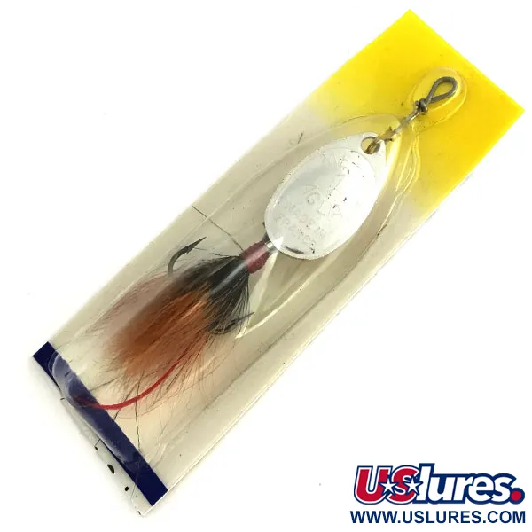 Postříbřený list charakterizuje tuto 3,5 g (1/8 oz) rotační třpytku, která je základním prvkem v nabídce Mepps. Tento model Aglia 1 dressed, identifikovaný pod kódem 8678, měří celkově 6 cm (2 1/4"). Nástraha je nepoužitá a zůstává zatavena v originálním balení se žluto-bílým kartonem z éry Mepps Fishing Guide z Antigo ve Wisconsinu. Její péřový střapec obsahuje tmavě hnědá a černá vlákna s výrazným červeným prvkem u kořene trojháčku. List nese tradiční ražbu, odkaz na francouzský design Andreho Meulnarta z roku 1938, který byl později přenesen do Spojených států. Sestava se skládá z amerických i zahraničních dílů, což udržuje vysoký standard značky. Průhledný blistr zůstává neporušený a chrání reflexní stříbrný povrch i integritu ručně vázaného péřového ocasu.