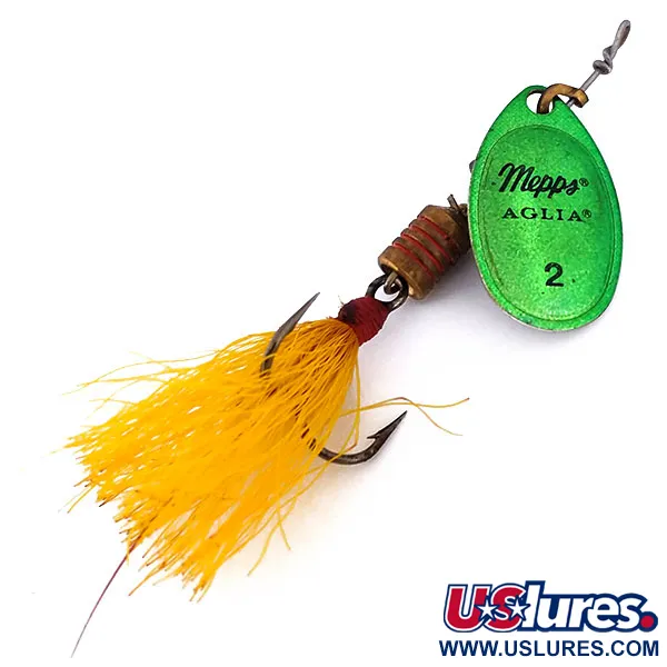 Výrazný povrch v barvě Green Metallic kryje líc listu velikosti 2, který nese klasické označení a číslování „Mepps AGLIA“. Tento exemplář měří 5,5 cm a váží 4,7 g. Na rubové straně listu je jasně viditelná ražba „MADE IN FRANCE“ na stříbrném kovu, což je přímý odkaz na původní design Andreho Meulnarta z roku 1938. Tělo tvoří řada mosazných a bronzových korálků vedoucích k trojhůčku s doplňkem z jasně žlutých chlupů. Tato rotační třpytka Aglia 2 dressed, katalogizovaná pod kódem 10197, představuje konstrukční školu, kterou v USA v 60. letech zpopularizoval Todd Sheldon. S hodnocením 5/5 vykazuje nástraha vynikající zachovalost s ostrým textem a neporušeným střapcem. Vnitřní kuželový rotační systém i drátěné komponenty zůstávají v původním vyrovnání.