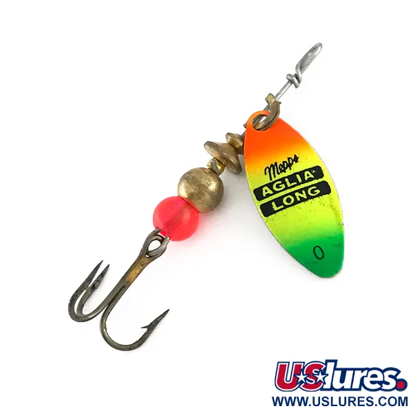 Tato rotační třpytka velikosti 0 s aerodynamickým profilem o délce přesně 5 cm je klasickou volbou pro ultralehkou přívlač. List ve tvaru vrbového listu má na přední straně zářivou vícebarevnou povrchovou úpravu přecházející ze sytě oranžové do jasně limetkově zelené. Zadní strana listu odhaluje mosazný povrch s jasně vyraženou značkou výrobce, která potvrzuje původ ve Francii. Středová osa nese sestavu mosazných závaží, včetně výrazného velkého kulovitého korálku a dvou menších texturovaných disků, které zajišťují hmotnost 2,6 g potřebnou pro přesné nahazování. Přímo nad trojháčkem je umístěn jeden vysoce viditelný neonově růžový korálek, který slouží jako bod útoku pro pstruhy nebo okounovité ryby. Přestože hlavní součásti produktu s kódem 8142 jsou francouzské, finální montáž proběhla v USA. Exemplář s hodnocením 5/5 vykazuje velmi zachovalý hardware i lak, přičemž původní černé nápisy na lícní straně listu zůstávají ostré.