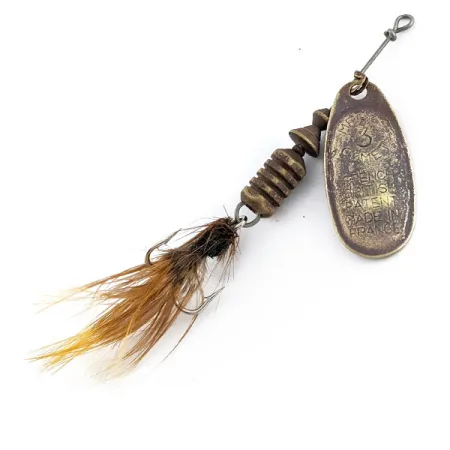 Na mosazném listu, který nese jasně vyražené ikonické označení „3 COMET“ a francouzsko-britské patentové značky, se zrcadlí transatlantická historie značky Mepps. Tato rotační třpytka z poloviny minulého století váží 6,5 g (1/4 oz) a vyznačuje se modulární konstrukcí. Drátěný rám o délce 7 cm umožňuje rychlou výměnu trojháčku s vázaným peřím. Jednotlivé komponenty byly vyrobeny ve Francii a následně sestaveny v USA, což byla v 60. letech běžná praxe definující éru modelu 20052. Mosazné tělíčko se skládá z charakteristického rýhovaného válečku a kuželové podložky, přičemž nese autentickou patinu odpovídající hodnocení stavu 3/5. Trojháček je stále osazen původním hnědým a rezavým peřím, které nástraze dodává přirozený profil. Tento exemplář reprezentuje klasickou francouzskou geometrii listu navrženou pro efektivní nahazování a různé techniky vedení nástrahy.