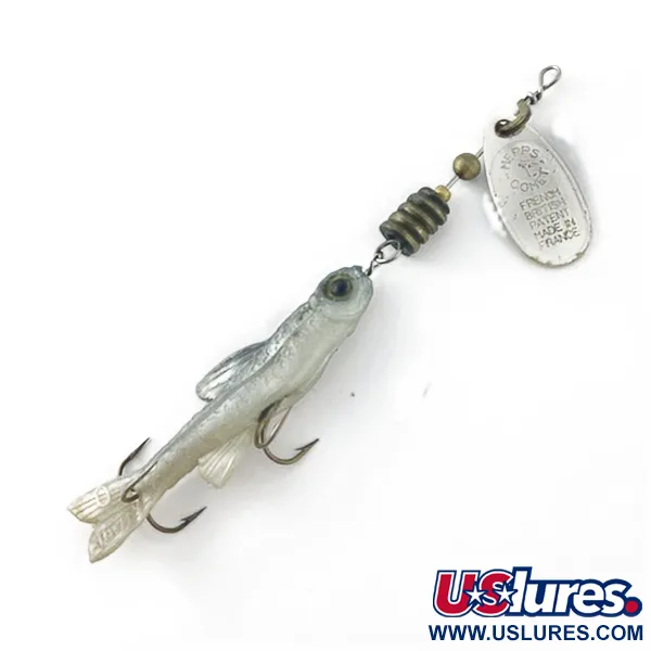 Stříbrný list s vyraženými údaji o francouzském a britském patentu zdůrazňuje evropský původ této nástrahy Mepps Comet Mino 1, evidované pod produktovým kódem 23634. Nástraha o hmotnosti 4,5 g kombinuje klasickou rotační třpytku s průsvitným měkkým tělíčkem ve tvaru rybičky, které je navrženo tak, aby se pohybovalo za listem. Konstrukce zahrnuje mosazné korálky a vrstvenou žebrovanou zátěž, která zajišťuje potřebnou hmotnost pro nahazování. Ve stavu 4/5 je tento exemplář mimořádně zachovalý a vykazuje pouze mírné známky stáří odpovídající 70. létům. Přestože byly jednotlivé díly vyrobeny ve Francii, tento konkrétní model byl sestaven v USA. Stříbrná povrchová úprava listu zůstává lesklá a háčky jsou správně usazeny v poddajném materiálu tělíčka.