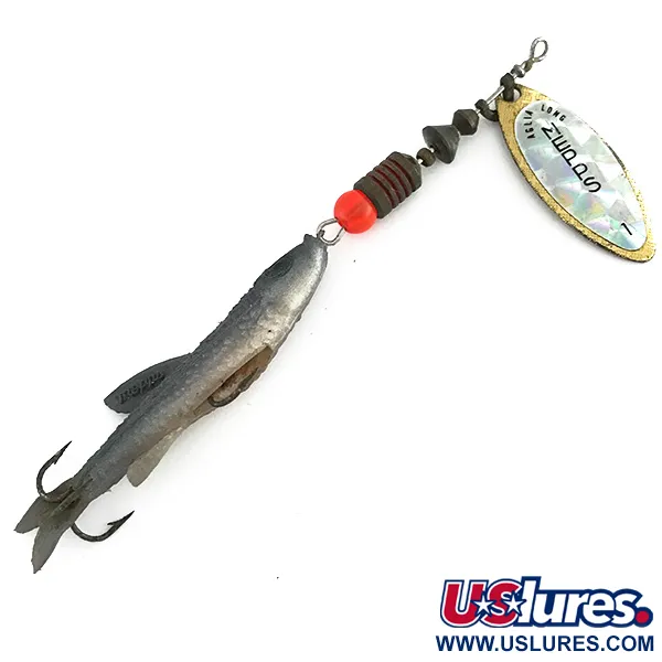 Tato klasická rotační třpytka o hmotnosti 7 g (1/4 oz) vyzdvihuje historickou spolupráci mezi francouzskými komponenty a americkou montáží. Stříbrný list je opatřen texturovanou holografickou nálepkou navrženou k odrazu světla, s jasně vyraženým názvem Mepps. Sestava o délce 9 cm (3 1/2") kombinuje tradiční rotační list s realistickým tělem gumové rybky z měkčeného plastu. Zářivě červený korálek tvoří ohnisko v přední části nástrahy, následovaný řadou žebrovaných černých distančních podložek. Měkká rybka je osazena trojháčkem na ocase a vnitřním háčkem pro udržení tvaru. Tento exemplář s produktovým kódem 8483 zůstává ve vynikajícím stavu s hodnocením 5/5, což dokazuje neporušenost měkkého těla a lesk kovových částí. Zadní strana listu odhaluje kvalitu francouzských komponentů, které jsou poznávacím znamením produkce značky v této éře.