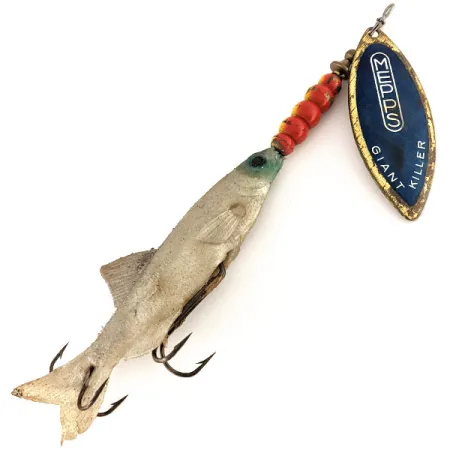 Tato robustní třpytka s hmotností 40 g (1 1/3 oz) měří celkem 17 cm (6 3/4"). List 'Giant Killer' vyniká modrým povrchem s bílým nápisem, zatímco rubová strana si zachovává přirozený mosazný vzhled. Červené a žluté korálky na ose vytvářejí výrazný kontrast před měkkým tělem gumové rybky. Tato nástraha s kódem 12474 pochází z období, kdy se komponenty vyrobené ve Francii sestavovaly v USA pro severoamerický trh. Tělo se stříbrnými šupinami doplňuje modrozelené oko a tmavé háčky. Exemplář je v zachovalém stavu 4/5 a vykazuje lehké známky skladování a běžného používání na kovových částech. Tmavé trojhorky jsou umístěny na břiše a ocase měkkého těla rybky.