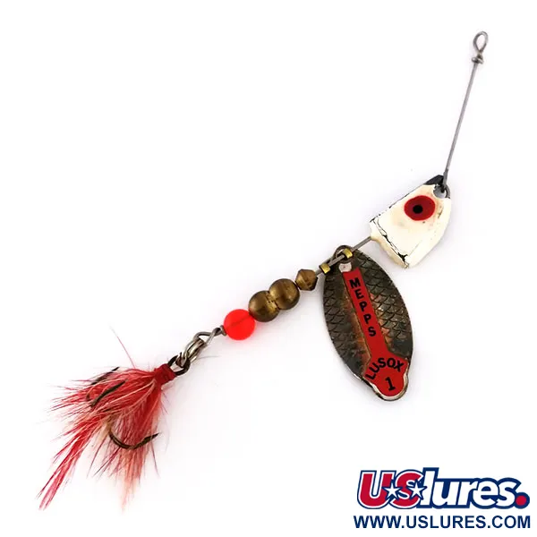 Mosazně zbarvený rotační list s výrazným červeným štítkem a nápisem „MEPPS LUSOX 1“ identifikuje tento exemplář vyrobený v USA. Konstrukce o délce 7,5 cm (3") a hmotnosti 10 g (1/3 oz) je postavena na pevném drátěném rámu. Sestava obsahuje olověnou hlavičku v bílo-černém provedení s výrazným červeným okem, následovanou třemi mosaznými korálky a zářivě oranžovým distančním korálkem. V zadní části je připevněn červený trojháček s peřím, který dodává kovovému profilu jemný vizuální prvek. S hodnocením stavu 4/5 zůstávají lakované detaily a kovové povrchy dobře zachovalé, vykazují pouze mírné známky stáří. Tento model s produktovým kódem 10198 využívá klasický design výměnných hlaviček typický pro sérii Lusox, navržený pro efektivní prezentaci v různých hloubkách.