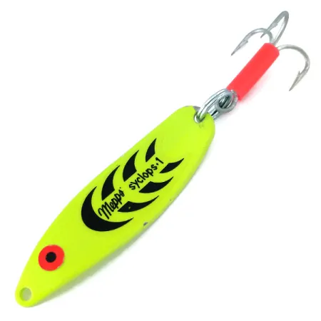Jasně zářící pod UV světlem, výrazný odstín chartreuse této plandavky Mepps Syclops 1 UV z ní činí vysoce viditelný nástroj pro hluboké vody nebo zamračené dny. Tato plandavka pocházející z Francie měří 6 cm (2 1/4") a váží 12 g (2/5 oz), přičemž nese charakteristický profil ve tvaru S, který definuje tuto sérii. Povrch je detailně zdoben černou grafikou ve tvaru půlměsíce a jasným označením značky, spolu s červeným bodem útoku u očka pro navázání. Na zádi je připevněn ostrý trojháček chráněný jasně červenou plastovou bužírkou, která doplňuje fluorescenční tělo. Pod kódem 11032 je nástraha ve stavu 5/5, přičemž si zachovává čistý a zářivý vzhled na celém svém povrchu. UV reaktivní vlastnosti umožňují plandavce vyzařovat silnou zelenou luminiscenci při vystavení ultrafialovému světlu, což poskytuje alternativní vizuální profil v tmavém prostředí.