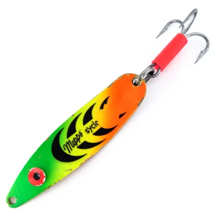 Barvy Fire Tiger plynule přecházejí ze zářivé chartreuse zelené na špičce do sytě oranžové na konci této 17g (3/5oz) plandavky. Kovové tělo o délce 7,5 cm (3") zdobí řada černých žebrovaných akcentů a charakteristické červené oko. Tento konkrétní model Mepps Syclops 2 UV, vedený pod kódem 10538, je konstruován pro maximální viditelnost; UV aktivní povrchová úprava zajišťuje jasný odlesk v hlubší vodě nebo při zatažené obloze. Trojhák je osazen červenou bužírkou jako bodem útoku, což je klasický francouzský prvek tohoto výrobce. Stav nástrahy je velmi dobrý (4/5), přičemž lak i značení zůstávají ostré a zřetelné po celém povrchu. Branding je úhledně vyražen vedle černých srpkovitých tvarů na konvexní straně plandavky.