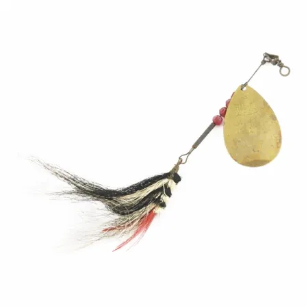 Leštěná mosaz dodává listu ve tvaru kapky této rotační třpytky Miller #3 MFG Springwater klasický lesk. Při délce 10 cm (4") váží nástraha 7 g (1/4 oz), což umožňuje efektivní nahazování. Tři průsvitné červené broušené korálky vytvářejí vizuální kontrast k drátěné ose a mosazným prvkům. Tato třpytka s kódem 24496 představuje řemeslnou zručnost Miller Fishing Lure Co. vyráběnou od roku 1929. Háček je bohatě osazen kombinací černých a bílých chlupů, zakončený jasně červeným pírkem. Celkový stav je velmi dobrý (4/5). Kovová rozpěrka odděluje korálky od očka a zajišťuje volnou rotaci listu kolem osy.