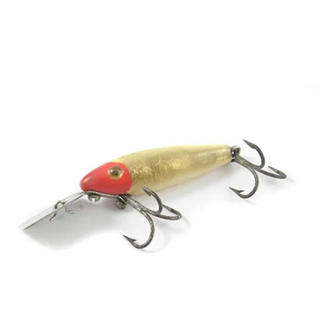 Kovové nořítko je jasně raženo nápisem „L&S 1M SINKER“, což identifikuje tento konkrétní potápivý model vyrobený společností L&S Bait Company v USA. S délkou pouhé 4 cm (1 1/2") a hmotností 2,5 g (3/32 oz) je díky své kompaktní velikosti specializovaným nástrojem pro lov štik nebo candátů. Barevné provedení kombinuje zářivě červenou hlavu s třpytivým zlato-bílým tělem, což je variace na vysoce kontrastní vzory, díky nimž se série MirrOlure stala základem výbavy rybářů poloviny století. Model je vybaven dvěma břišními trojháčky a pevným kovovým nořítkem, které slouží zároveň jako očko pro uchycení vlasce. S hodnocením stavu 4/5 vykazuje tento kus jen velmi mírné známky používání, přičemž povrchová úprava i jasnost značení na kovových částech zůstaly zachovány. Kód 2748 představuje designový vývoj nástrah L&S, které byly ceněny pro svou odolnou konstrukci a výraznou vnitřní odrazivost.