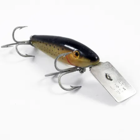 Tato malá potápivá nástraha s raženým nápisem „L&S USA“ na své charakteristické hranaté kovové lopatce představuje klasickou éru amerického designu nástrah společnosti L&S Bait Company. MirrOlure měří 4 cm (1 1/2") a váží 2,5 g (3/32 oz). Nabízí vzor Pstruh s tmavě šedým hřbetem přecházejícím do zlatožlutých boků. Boky pokrývá jemné černé tečkování, doplněné o červenou zakřivenou linku za okem simulující žábry. Tento exemplář je ve stavu 5/5, přičemž barva i hardware zůstaly velmi dobře zachovány. Konstrukce využívá dvoušroubové upevnění potápivé lopatky, které poskytuje zátěž potřebnou pro potápivou nástrahu určenou pro lov štik nebo candátů. Hardware se skládá ze dvou trojháčků v matném provedení, což odráží účelný design běžný v americké výrobě poloviny 20. století.