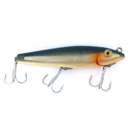 Boky se vzorem šupin v bohatém zlatém provedení definují estetiku této nástrahy L&S Bait Mirrolure 7M24, klasického hladinového „walkera“ z USA. Tento specifický model o délce 11 cm (4 1/4") a hmotnosti 11 g (2/5 oz) má tmavě modrozelený hřbet přecházející do strukturovaných metalických boků, doplněný výraznou červenou značkou žaber u hlavy. Velké, nápadné žluté oči jsou umístěny těsně pod horním očkem pro vlasec, což je typický konstrukční rys řady 7M určené pro hladinovou prezentaci v hloubce 0 m. Osazeno třemi ostrými trojháčky, které zůstávají lesklé a funkční. Tento exemplář s produktovým kódem 10990 vykazuje vynikající stav zachování s hodnocením 5/5. Sběratelé ocení barevný vzor M24, který byl základem pro lov okounů, štik a pstruhů přívlačí nebo trollingem. Jeho štíhlý profil ve tvaru doutníku je navržen tak, aby se držel vysoko ve vodním sloupci.