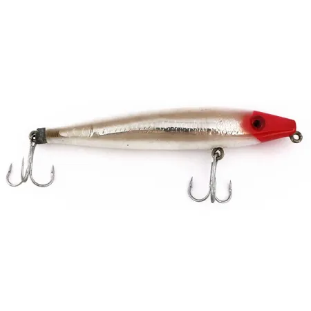 Tato hladinová nástraha vyrobená v USA o hmotnosti přesně 1/2 oz (14 g) je klasickým příkladem řemeslného zpracování L&S Bait Mirro lure. MirrOlure Top Dog, označený produktovým kódem 10219, měří 4 1/4" (10,5 cm) a má plovoucí konstrukci navrženou speciálně pro lov na hladině. Tento exemplář se vyznačuje výraznou červenou hlavou, která přechází v perleťově stříbrné tělo, což je vysoce viditelná barevná kombinace oblíbená při lovu štik a velkých okounů. Výbava se skládá ze dvou robustních trojháčků – jednoho na břiše a jednoho na ocase – připevněných odolnými kovovými očky. V červené hlavové části je zasazeno jednoduché černé oko, které tvoří jasný bod zájmu. Tato konkrétní nástraha je ve vynikajícím stavu s velmi dobře zachovalým povrchem, což odpovídá hodnocení stavu 5/5. U držáku ocasního háčku je přítomen rozšířený kovový límec, což je specifický detail sestavy tohoto plovoucího walkeru.