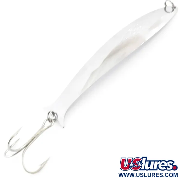 Leštěné postříbření odráží světlo po celé délce 9,5 cm (3 3/4") této kanadské klasiky. Plandavka Mooselook wobbler od značky Williams s hmotností 10 g (1/3 oz) je základní výbavou pro rybolov v hlubokých severských vodách. Je navržena s výrazným podélným prolisem, který dodává tělu tuhost a štíhlý tvar. Tento konkrétní kus s produktovým kódem 4074 se pyšní legendárním pokovením drahými kovy v dokonalém stavu, zářivým jako v den výroby. Podlouhlý profil imitující nástražní rybku se zužuje směrem k rozšířenému ocasu, kde je osazen ostrý trojháček. Jako nástroj primárně určený pro trolling spoléhá při svém pohybu na rovnováhu mezi váhou raženého kovu a odporem vody působícím na zakřivené plochy. Vyražené jméno Mooselook na stříbrné straně je známkou kvality značky, která se na vysoce reflexní povrchové úpravy zaměřuje již od počátku 20. století. Jednoduchý kroužek v přední části slouží jako bod pro připevnění návazce.