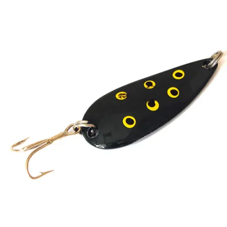 Tato plandavka Moriyama o hmotnosti 11 g (2/5 oz) disponuje potřebnou hustotou pro dosažení hlubších cílů během náhozu. Nástraha pocházející z Japonska je vyvedena ve vysoce kontrastním vzoru zvaném Frog, který se vyznačuje sytě černou horní stranou zdobenou pěti výraznými žlutými kruhy. Kovové tělo ve tvaru slzy o délce 5 cm (2") má zadní stranu s povrchovou úpravou z leštěného niklu pro intenzivní kovový lesk. Tento konkrétní exemplář s produktovým kódem 0902 je ve stavu 4/5 a vykazuje pouze drobné povrchové opotřebení odpovídající jeho vintage původu. Je osazen bronzovým trojháčkem připevněným pomocí kroužku, přičemž další kroužek na špičce slouží k bezpečnému navázání vlasce.