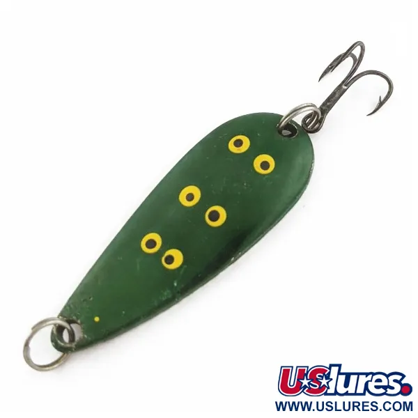 Tato 5cm plandavka vyvedená v tmavě zeleném vzoru „Frog“ se vyznačuje šesti výraznými žlutými tečkami s tmavým středem, které jsou symetricky rozmístěny po kovovém těle. Konstrukce nástrahy od japonského výrobce Moriyama s klasickým kapkovitým profilem je určena pro nahazování i trolling. Kovová třpytka o hmotnosti 12 g je osazena původním trojháčkem, jenž je připevněn robustním kroužkem v zadní části. Druhý kroužek v přední části slouží ke snadnému navázání na vlasec. U tohoto exempláře s produktovým kódem 24123 nese lak viditelné stopy používání, což odpovídá hodnocení stavu 3/5.