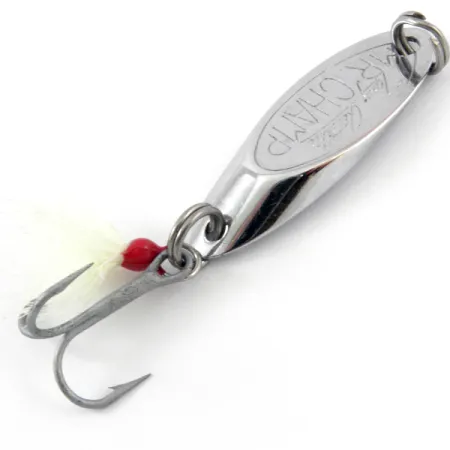 Nápisy „MR CHAMP“ a „Tony Accetta“, hluboce vyražené do leštěného chromování, označují tuto 8g (1/4oz) plandavku za klasický kus amerického rybářského náčiní. S délkou 4 cm (1 1/2") představuje produktový kód 3846 variantu s peřím, která je na zadním trojháčku opatřena bílou péřovou vazbou. Malá, zářivě červená hlavička zakončuje úvaz peří a vytváří kontrast k stříbřitému lesku těla. Tento exemplář je ve vynikajícím stavu (hodnocení 5/5) a vypadá nepoužitý, bez známek opotřebení na pevných kroužcích nebo vysoce lesklém povrchu. Masivní kovové tělo je zúžené pro lepší nahazování a na zadní straně je jasně viditelný identifikační štítek. Péřový ocásek je bezpečně uvázán a originální trojháček zůstává ostrý a konstrukčně v pořádku.