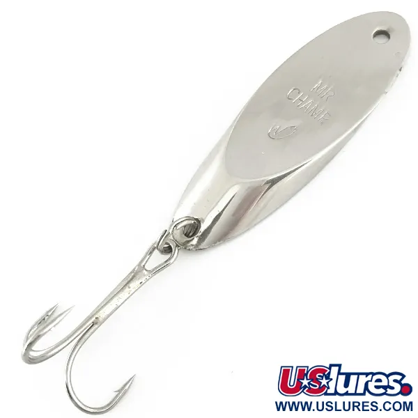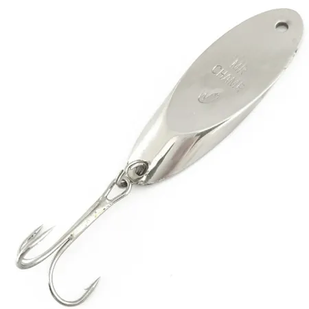 Poniklovaný povrch dodává této 21g (3/4oz) kovové nástraze klasický reflexní vzhled. Vyrobil ji Weber, americký výrobce se stoletou tradicí v rybářském průmyslu; model Mr Champ byl později převzat značkou Luhr Jensen. Tělo měří 6cm (2 1/4") a nese název „MR CHAMP“ vyražený přímo do kovu. Tento konkrétní kus s kódem produktu 6932 je ve špičkovém stavu s hodnocením 5/5. Pro navázání slouží čisté očko na zúžené hlavě a na ocase je pomocí kroužku upevněn trojháček.