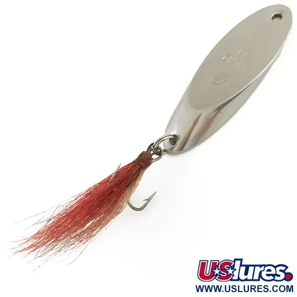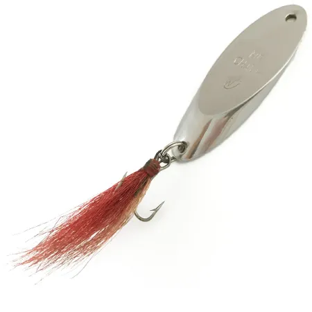Tato poniklovaná plandavka o hmotnosti 21 g (3/4 oz) představuje rané americké výrobní období společnosti Weber, než model později převzala firma Luhr Jensen. Tělo o délce 6 cm (2 1/4") má jasný, reflexní povrch v barvě Nickel, který je stále ve stavu 5/5, což svědčí o vysoké péči věnované tomuto vintage kousku. Na kovu je jasně vyražena značka MrChamp spolu s kódem produktu 6130, který označuje tuto specifickou variantu s peřím. Jednoháček je osazen ručně vázaným střapcem z červených chlupů, bezpečně upevněným tmavým ovinem. Je navržena jako všestranná vláčecí nástraha a díky své robustní konstrukci a americkému původu je základním kamenem každé sbírky rybářského náčiní z poloviny století.