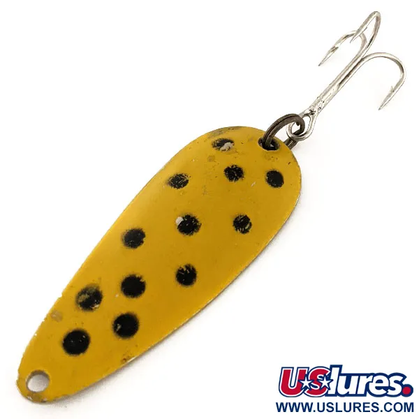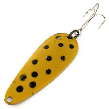 Žlutý lak s velkými, ručně raženými černými tečkami pokrývá konvexní stranu této 5,5cm kovové plandavky. Nebco FlashBait 266 o hmotnosti 10 g má zadní stranu z leštěného niklu, do které je vyražena značka „FLASH BAIT NEBCO“ a původ USA. Výbavu tvoří tmavě tónovaný spojovací kroužek a ostrý trojháček. Tento vintage exemplář, katalogizovaný pod kódem 11765, má hodnocení stavu 4/5; vykazuje drobné opotřebení způsobené skladováním, zatímco lak a ražba zůstávají zřetelné.