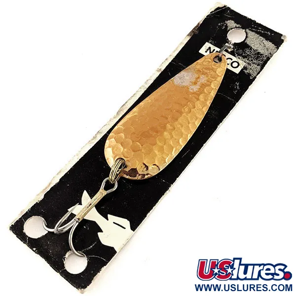Tepané zlaté textury dominují konvexní straně této klasické kovové plandavky a poskytují vysoce lesklý povrch navržený pro odraz světla. S hmotností 10 g (1/3 oz) a délkou 5,5 cm (2 1/4") je Nebco Flashbait 266 (kód produktu 12448) typickým příkladem amerického řemesla poloviny století z Minneapolis v Minnesotě. Zadní strana má hladký, leštěný povrch s hluboce vyraženým logem ryby a označením „FLASH-BAIT 266 NEBCO“. Vyrobeno v USA, pevná kovová konstrukce je osazena ostrým trojháčkem a originálními kroužky. Tento exemplář je nepoužitý, zachovává si jasný tovární lesk, je ve stavu 6 a stále připevněn k původní vintage kartě.