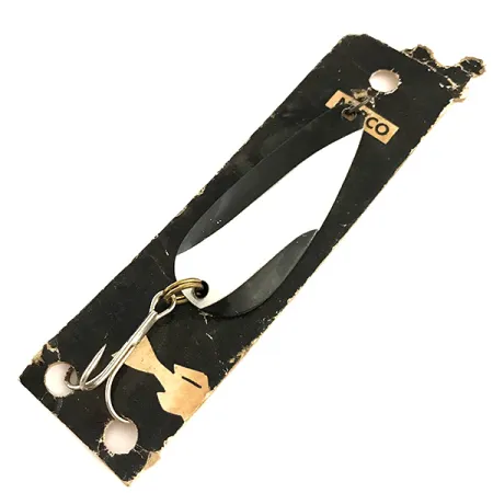 Tato v USA vyrobená třpytka o hmotnosti 10 g (1/3 oz) s leštěným niklovým tělem zůstala ve svém původním nepoužitém stavu. Nebco FlashBait 266 (kód produktu 6421) měří na délku 5,5 cm (2 1/4") a představuje skvěle zachovalý sběratelský kousek, stále připevněný k původní černobílé prodejní kartě. Niklový povrch poskytuje vysoce kontrastní reflexní plochu, typickou pro plandačky z této éry určené k přívlači. Ostrý trojháček je připevněn mosazným kroužkem, což odpovídá původnímu továrnímu osazení. Tento exemplář je klasifikován stupněm 6, což znamená, že je nepoužitý a od své výroby byl uchováván jako sběratelský předmět. Grafika na obalu zůstává čitelná a kov nevykazuje žádné známky opotřebení nebo oxidace.