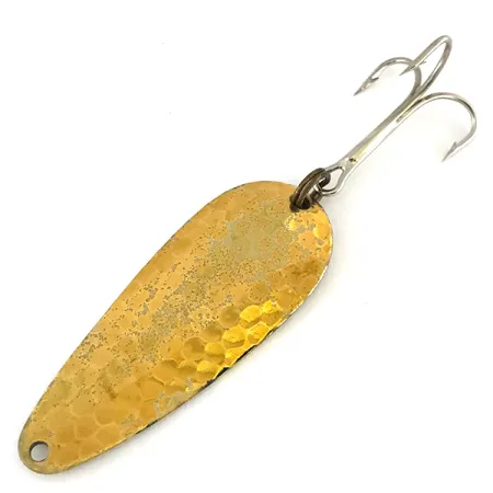 Tepaný zlatý povrch na přední straně odráží světlo z mnoha úhlů, čímž se tato vintage plandavka odlišuje od hladších variant. S délkou 5,5 cm (2 1/4") nabízí Nebco FlashBait 266 klasický kapkovitý profil ideální pro nahazování. Zadní strana zůstává hladká a nese jasnou ražbu 'NEBCO FLASHBAIT MPLS MINN', která potvrzuje původ z Minneapolis v Minnesotě. S hmotností 10 g (1/3 oz) má tato kovová plandavka značnou hustotu pro daleké hody. Tento konkrétní model s produktovým kódem 8214 zůstává ve vynikajícím stavu s hodnocením 5/5. Je vybaven ostrým trojháčkem zajištěným kroužkem v zadní části a otvorem pro návazec v přední části.