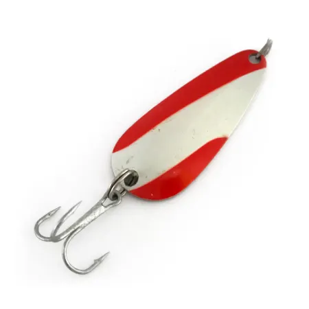 Diagonálně nanesené červené a bílé smaltované pruhy definují lícovou stranu této klasické plandavky, což je charakteristický vzhled pro Nebco FlashBait 2662. Tělo o délce 2" (5 cm) je vyraženo z masivního kovu a na zadní straně je opatřeno vysoce leštěným niklem, což vytváří výrazný kontrast k lakované straně. Tento exemplář byl vyroben v USA a na zadní straně listu nese zřetelnou ražbu „FLASHBAIT“ a značku výrobce. S hmotností 1/4 oz (8 g) poskytuje univerzální váhu pro rybáře s lehkým náčiním, kteří se zaměřují na druhy od okounů po pstruhy. Tato konkrétní jednotka, označená produktovým kódem 7932, je nepoužitá a zůstává ve vynikajícím stavu, přičemž vykazuje svůj původní tovární lesk na červeném, bílém i niklovém povrchu. Silný trojhák se stříbrnou povrchovou úpravou je připevněn pomocí robustního kroužku u základny plandavky.