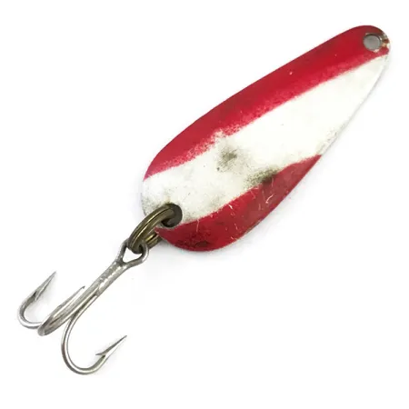 Nebco FlashBait 366 s kompaktní délkou 1 1/4" (3,4 cm) se vyznačuje klasickým červenobílým diagonálně pruhovaným dekorem na přední straně. Toto barevné schéma je po desetiletí stálicí v rybářských krabičkách, ceněnou pro svou vysokou viditelnost v různých podmínkách čistoty vody. Zadní strana plandavky odhaluje raženou mosaz, která hrdě nese značku výrobce a původ „MADE IN USA“. Produktový kód 4876 identifikuje tento model o hmotnosti 1/16 oz (1,9 g) v katalogu Nebco, navržený speciálně pro trolling. Výbavu tvoří jeden trojhák připevněný pomocí kroužku a čistý otvor pro navázání vlasce v zúžené špičce. S lehkými známkami předchozího používání na lakovaném povrchu a mosazném těle je tento kus hodnocen stavem 4/5. Ražený nápis na zadní straně dodává autentický nádech řemeslného zpracování z minulé éry americké výroby rybářských potřeb.