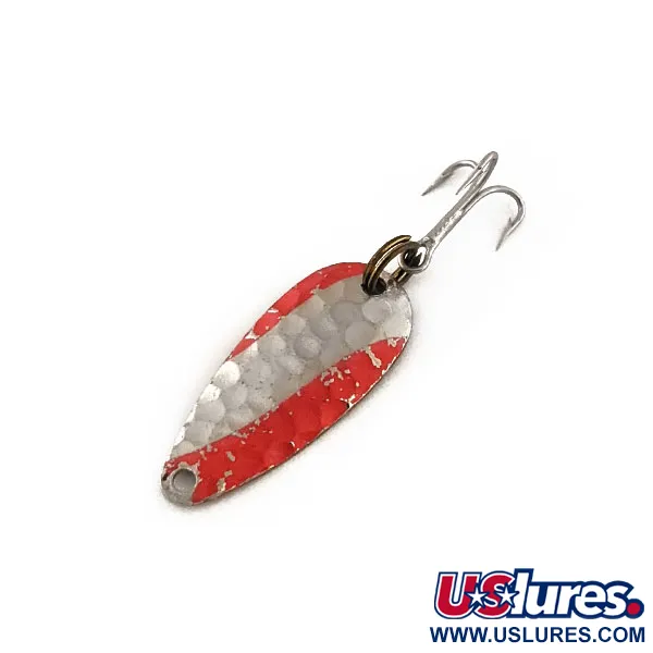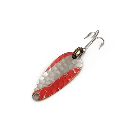Tepaný niklový povrch na lící plandavky definuje tento model Nebco FlashBait 466, drobný kousek americké rybářské historie vážící pouhých 1/32 oz (1 g). Tato nástraha o délce jen 3/4" (2,2 cm) se vyznačuje výrazným barevným vzorem s odvážnými červenými diagonálními pruhy na důlkovaném povrchu. Tento konkrétní model s produktovým kódem 11762 představuje klasický design Nebco určený pro precizní ultralehkou přívlač. Na hladké kovové zadní straně je jasně vyražen název značky a nápis „MADE IN USA“, což odráží výrobní dědictví dané éry. Osazení tvoří tmavě tónovaný kroužek v kombinaci s ostrým trojháčkem. Exemplář ohodnocený stavem 5/5 vykazuje skvěle zachovalý lak a ostré ražení, což z něj činí vynikající ukázku řemeslného zpracování mikrolžiček z poloviny minulého století.