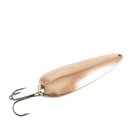 Měď tvoří základ této klasické plandavky a dodává jí hřejivý kovový lesk, který s časem krásně zestárl. S hodnocením 4/5 zůstává povrch jasný, přičemž na kovu jsou viditelné pouze lehké známky její rybářské historie. Na konkávní vnitřní straně je jasně vyraženo označení pro "NEBCO" FLASH-BAIT 66, které udává její původ v MPLS., MINN. USA. Tento exemplář, označený produktovým kódem 2823, měří 3 1/2" (9 cm) a váží 3/4 oz (21 g). Součástí výbavy je robustní trojháček připevněný kovovým kroužkem na širším konci, zatímco jeden vyražený otvor na užším konci slouží jako bod pro připevnění karabinky nebo návazce. Její protáhlý kapkovitý profil je konstruován pro tradiční přívlač nebo trolling ve sladkovodním prostředí.