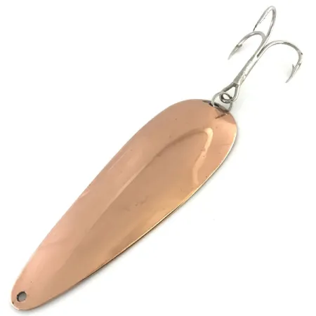 Lesklý měděný povrch charakterizuje tuto těžkou plandavku, která poskytuje hluboký, teplý lesk vynikající v každé sbírce historických nástrah. Tato Nebco FlashBait 66 o váze 3/4 oz (21 g) měří 3 1/2" (9 cm) a vyznačuje se klasickým protáhlým kapkovitým profilem navrženým pro daleké hody nebo hlubinný trolling. Na zadní straně plandavky je jasně vyraženo "NEBCO" FLASH BAIT 66 a její původ MPLS. MINN., což ji identifikuje jako kus rybářské historie Středozápadu USA. Je vybavena velkým stříbřitým trojhákem připevněným pomocí robustního kroužku v zadní části. S hodnocením 5/5 vykazuje tento exemplář výjimečnou péči, přičemž si zachovává leštěný povrch a čisté hrany. Je katalogizována pod produktovým kódem 8632 a představuje zachovalý příklad funkčního designu náčiní z Minnesoty.