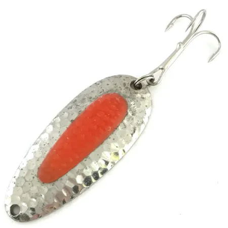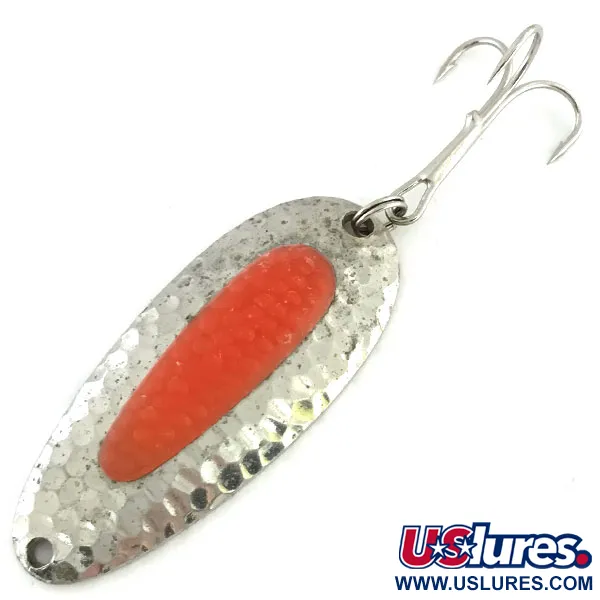 Povrchová úprava z tepaného niklu na těchto klasických plandavkách poskytuje texturovaný povrch navržený tak, aby zachycoval a rozptyloval světlo do více směrů pod vodou. Tato Nebco Pixee UV, označená produktovým kódem 9460, váží 3/4 oz (24 g) a měří 2 1/2 palce (6,5 cm) na délku. Výrazným fyzickým rysem tohoto modelu je vložená imitace lososího jikry; zatímco za denního světla se jeví jako zářivě růžová nebo lososová, je navržena pro vysokou viditelnost v hluboké vodě. Tento kus si zachovává čistý, jasný povrch na svém masivním mosazném těle a nevykazuje žádné známky opotřebení na původním trojháčku, čímž získává hodnocení stavu 5/5. Hustota nástrahy umožňuje daleké náhozy v pobřežním větru nebo dosažení dna hlubokých říčních tůní, kde se shromažďují pstruzi duhoví a lososi. Konstrukce je zaměřena na odolnost, obsahuje pevný kovový rám a bezpečně usazenou plastovou vložku, která zůstala po celá léta neporušená.