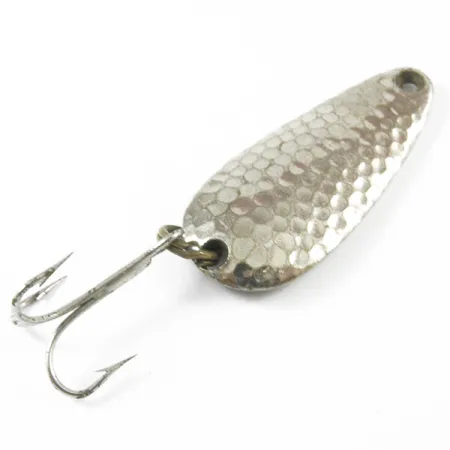 Tato 4 cm (1 1/2") plandavka s hluboce tepaným niklovým povrchem je navržena tak, aby maximalizovala plochu pro odraz světla. Zadní strana zůstává hladká a nese zřetelnou ražbu 'NEBCO TOR-P-DO 1 MPLS. MINN.', která dokládá její původ z Minneapolisu. Tento konkrétní kus s kódem 3277 váží 7 g (1/4 oz), což z něj činí skvělou volbu pro lov pstruhů nebo okounů přívlačí. Osazení tvoří klasický trojhák upevněný pomocí kroužku, obojí s udržovaným povrchem. Plandavka je v kondici 4/5, niklování si zachovává vysoký lesk na obou stranách jen s mírnými stopami stáří. Očko pro navázání je čistě vyvrtáno v zúžené části, připraveno pro přímý uzel nebo malou karabinku.
